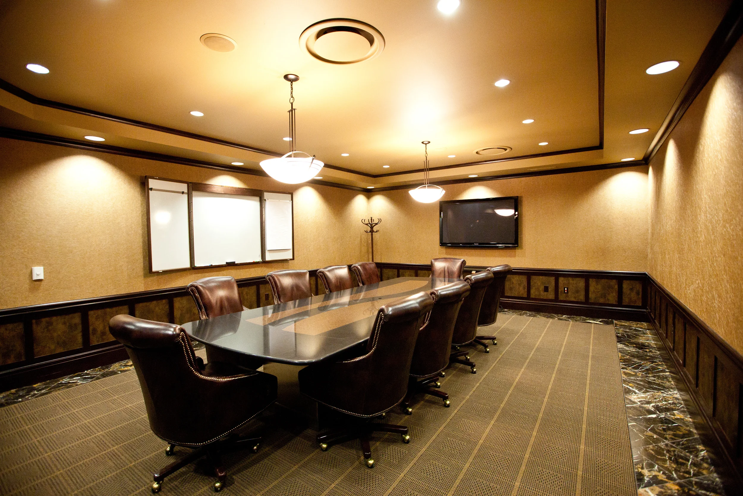 Tenant exclusive executive style conference room features oversized conference table, leather seating for 10, phone and video conferencing capabilities, and wet bar.